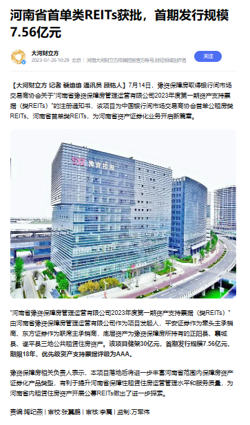 全省首單!豫資保障房類REITs項目正式獲批!引多家省級媒體轉發(fā)